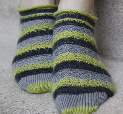 To knit these socks, you need to know how to work flat and in the round, pick up stitches along an edge, work basic decreases (k2tog, ssk, p2tog), slip stitches, and use Kitchener stitch to graft live stitches. This pattern has been professionally tech edited.