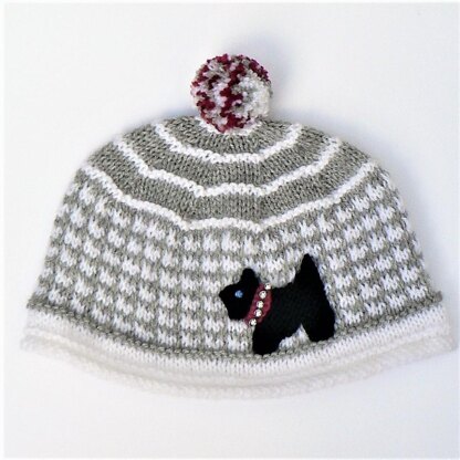 Scotch Bonnet is a quick-to-knit rolled brim beanie hat featuring a houndstooth stitch pattern and a little (separately knitted) Scottie dog, complete with beaded collar.
