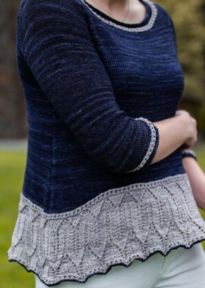 The Scottish Highlands Top is inspired by ancient Abbey ruins in Scotland and is worked top-down, seamless, and in the round. It uses some of the same design elements as the Scottish Highlands Shawl, added slight A-line shaping, and an angled hemline for a casual and flattering fit.