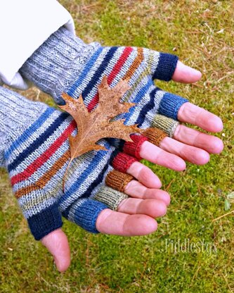 My step-son’s girlfriend likes bold colors so I made her these brightly striped fingerless mitts for Christmas. They’re a great way to use up all those little leftover balls of sock yarn! Knit in the round with a striped pattern, these mitts knit up in no time.