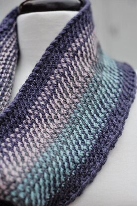 You know those big, bulky cowls that use enormous yarn and knit up in a couple of hours? Well, because you are holding your yarn doubled up and using a big ole needle, this pattern knits up like one of those bulky cowls but manages to not actually be bulky.