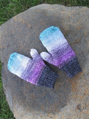 These fingering weight mittens are light-weight & fun to knit. Use several colors of yarn—scraps, or odd-balls, or purposely purchased coordinating sets—to create striped mittens with small amounts of stranded knitting to help blend the colors into one another.