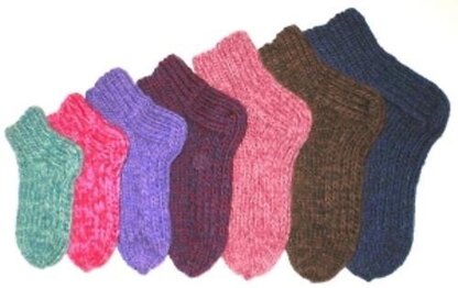 About the Design This slipper sock is in 7 quick-to-knit sizes, using 2 strands yarn held together. The design uses Heel Stitch, in the heel flap and turn, but, along the sole, which adds cushiness to the sock, for wear and comfort. I’ve held 2 colors together in each sample, for a marl effect.