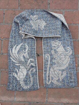 The designs on this scarf are adapted from gold objects made by the ancient Scythians. The designs include a lion, griffin, and triple horse head.
