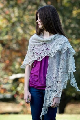 Sea Fog represents my return to the delights of lace weight knitting. Like its oceanic namesake, Sea Fog is delicate and airy: a mist-like shroud for your shoulders when the weather turns cool. Sea Fog is an elongated triangle that transitions to a crescent, giving it extra depth than a traditional crescent, but still retains the eye-catching curve that gives a crescent shawl its visual appeal. Central increases are hidden in the central motif that advances down the stockinette body, and then blossoms into a deep lace edge embellished with nupps and beads, flower motifs and arches.