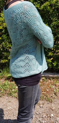 The cardigan is knitted from top down seamlessly. You will start with the collar in garter stitch, then you will do an increase set to shape the yoke, including a lace pattern. Then you separate body and sleeve, finally you will knit the body: the front in stockinette st and the back in lace to finish with an I-cord. The sleeve will be knitted in round at the end in stockinette st and will end with a lace pattern and I-cord.