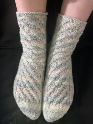 These socks are knit toe up. Cables run in opposite directions for each foot. Pattern is written instruction only and does not include chart.
