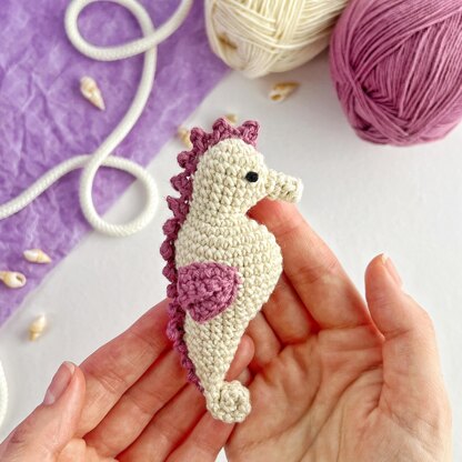 The finished crochet seahorse is about 10 cm (4 inches) in size.