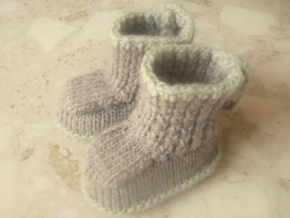 A great way to knit baby boots with no seaming. You will need 6-8 buttons for the back fastening, as well as 1 50g ball of main colour and a small amount of a contrasting colour for the trim.