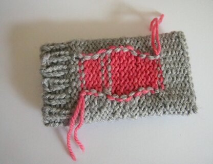 Intarsia 'in the round' is a seamless way to achieve a block of colour in hats, toys, sweaters, mittens etc. It is not technically knitting in the round as the work is turned and purled each row, but, it looks like knitting in the round and is completely seamless. A nine page photo tutorial of the method of intarsia in the round that I use, this includes step by step photos showing how to set up, knit and purl intarsia in the round. This tutorial includes: How to start a single block of intarsia on a knit or purl row. How to work intarsia in the round on both purl and knit rows. Instructions on how to add multiple blocks of color. Instructions on working with multiple blocks of color. A summary sheet. A simple pattern for a phone cozy with one block of color, this includes adding a plain round to the block and is both written and charted. This tutorial is written and photographed from the point of view of a right handed knitter.