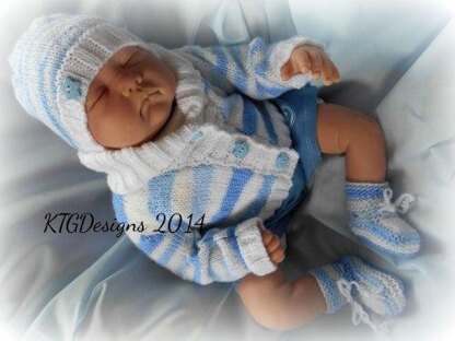Knitting pattern to knit the cardigan, hat and bootees set in size 0-3m. Very trendy for a baby boy wearing 0-3m size clothing. The cardigan has a lovely shawl collar, the hat is a pull - on style beanie hat and the bootees fasten with a tie.