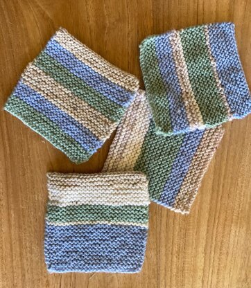 Ideal pattern for the beginner. Each coaster is knitted in garter st ( knit every row) with changing of yarn in different colours. Soft blues and greens are dominant but any coloured DK yarn can be used.