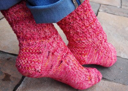 These lacy socks feature a simple eyelet pattern to keep your feet just warm enough when Spring fades and Fall comes. The heel patterning helps to take advantage of those more variegated colorways.