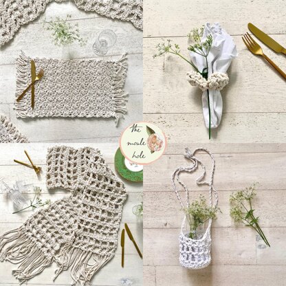 This beautiful table setting comes with 4 different patterns in one file. This includes the pattern to a table runner, placemat, napking ring and a hanging vase or plant pot holder. What a deal! I have used macrame cord but this is easily made with chunky cotton yarn.