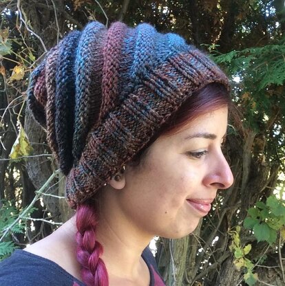 Featuring a unique construction, Sedona utilizes a self-striping yarn to highlight the bias welt fabric of the body. Sedona is knit in three parts. First, the slanted rib pattern is created by using increases and decreases to make a biased fabric knit flat that will later be seamed. Next, stitches are picked up to knit the ribbed brim. Lastly, stitches are picked up to purl the crown. This hat can be worn as a fun slouchy hat, or with the brim folded for a tighter fit. For a matching scarf, simply knit a longer version of the body!