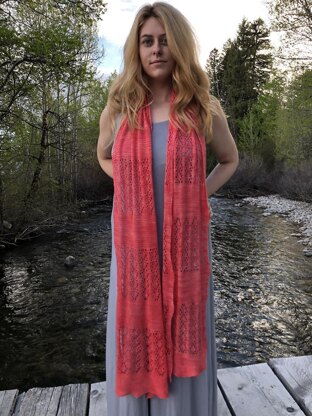 The Sedona Lace Scarf is a generously sized rectangular scarf which can also be worn as a shawl or wrap. With alternating panels of an easy-to-memorize lace stitch and garter stitch, knitting up this elegant scarf will keep you interested without being tedious.