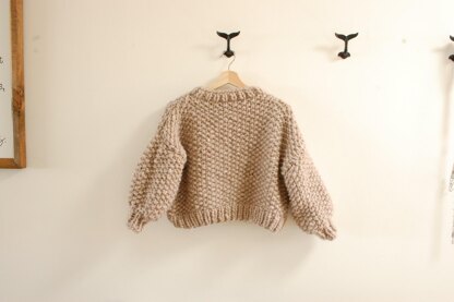 This Seed Stitch Sweater knitting pattern is a quick, intermediate knit. Cropped length with three quartered sleeves. Designed to be cropped and boxy on the body & sleeves to be large and puffy.