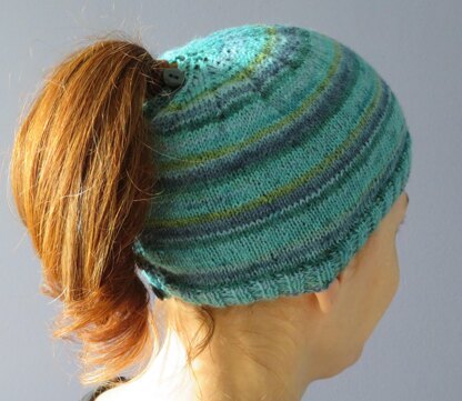 By using self-striping sock yarn, this fun ponytail hat gives you all the pizzazz of stripes without having to switch colors. It knits up quickly, and the buttons allow you to wear your ponytail (or bun) in whatever position you like: high, low, or in between. Just undo a button wherever you like to position your ponytail, or undo two buttons for a bun.