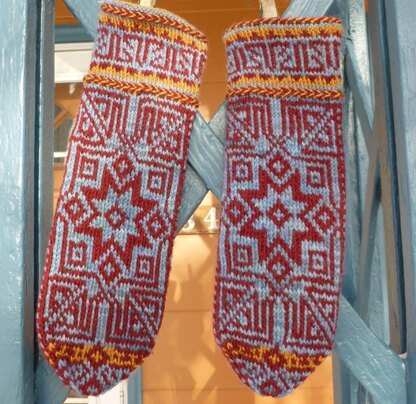 Seljuk mittens have a central star motif, a charted cuff bounded by two Latvian braids and a peasant thumb. The design on the front of the mitten is inspired by early Turkish textiles. The pattern has charts for two sizes, photos and written instructions. It includes instructions for the Latvian braid and a two color cast on.