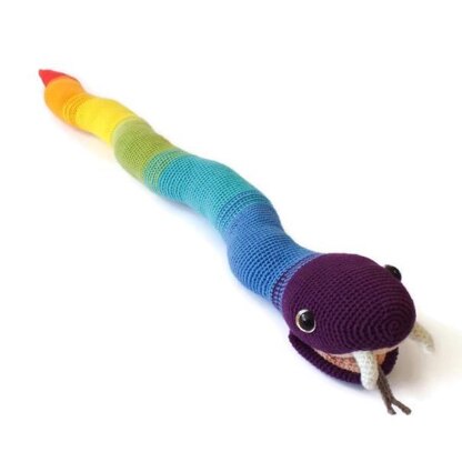 Using the materials suggested this snake measures 82cm (32.25 inches) for the wiggle and 92cm (36.25 inches) for the straight. Any yarn can be used with this pattern with an appropriate sized crochet hook to create a tight tension, although other yarns may affect the size of the finished snake. Suggested materials: DK (8ply) 100% cotton yarn, 3mm crochet hook, toy stuffing and 18mm cat eye safety eyes.