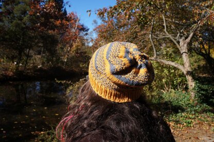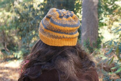 In the pattern the beanie uses Charcoal as Color A and Gamboge as Color B. This is reversed for the slouchy hat (top photo), which uses Gamboge as Color A and Charcoal as Color B. By reversing the colors I was able to knit both hats from just 2 skeins of yarn.