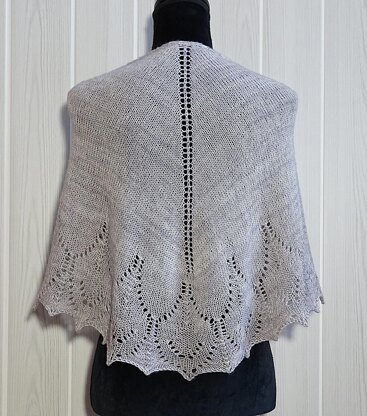 Serenity shawl starts at the center back of the neck with a garter tab and is knit down to the bottom edge. There is a 3-stitch garter border on each side. The shawl starts with a section in stockinette stitch. This is followed by a lace pattern that flows over the entire shawl. Once the lace edging begins, there are no more increases at the center spine of the shawl.
