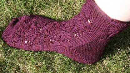 These socks get their name from the chart of the stitch pattern which resembles a snake’s head.  The socks are worked toe-up. A gusset is worked before a short-row heel using the German short-row technique. Once the heel is completed and the gusset stitches decreased away, the Serpent’s Head pattern is added to the back as well as the front of the sock leg. The sock is finished with a classic ribbed cuff.