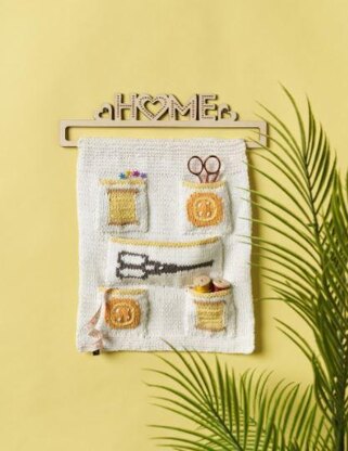 This is a pattern for a Sewing Things wall tidy, originally published in Simply Knitting. The motifs are worked in intarsia with added embroidery. Fabric lining is added to the back.