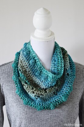 The Shades of Blue Cowl is crocheted with a mixed yarn which creates a beautiful cowl. The cowl consists of a filet stitch pattern of a diamond and bobble stitches.