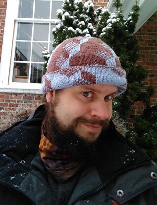 This hat is based on the tumbling-blocks pattern, reduced to two colors and further reduced by removing strips of the blocks, creating the illusion of blocks that fade into the background.