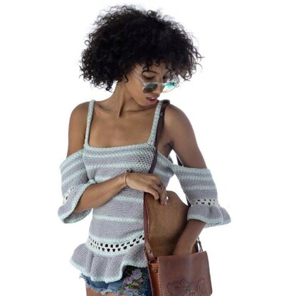 The top features 'sunlight lines' along the body of the top, with ruffles at the base and on the sleeves. Utilizing the linen stitch to create a super flexible and airy top in the summer heat.