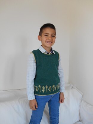 Shajar is a smart sleeveless sweater for boys (and girls !), with a motif of trees and contrasted borders. You can do it with a round neckline, or with a hood.