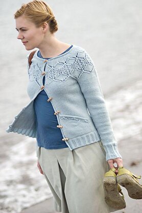 The cardigan is worked bottom-up; body and sleeves are joined at the underarm to work the yoke.