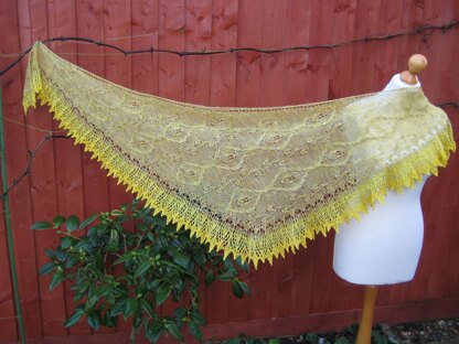 The shawl has an asymmetrical triangular shape, and is worked sideways. It is expanding up to the middle and then narrowing down using short-row knitting. The border worked using the open stitches on one side of the triangle and the rest is casted on out of the edge on the other side.