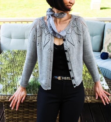 This is a cardigan knit seamlessly from the neckline towards the yoke and then divided into body and sleeves at the underarm. Initially, the design was made with a cropped length body and three quarter length sleeves with my friend’s figure and her preference in mind. However, a version with longer body and sleeves is provided in this pattern. The hem of the cropped version rests 2.5 - 5 cm (1-2 inches) below the natural waist. It can be knitted longer with or without body shaping if preferred.