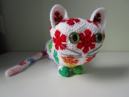 Meterage & sizes:  The size of your cat depends on the yarn you use.  If you are unsure of the amount of yarn you will need, I’d advise you to make a flower hexagon, and weigh that after each round. Multiply the amounts by 37 as an estimate of what you will need for the finished cat. Multiply the amount of the last round by 40 to account for the joining stitches.  Use a crochet hook that is one size smaller than your yarn label advises, to make sure you don’t get big holes.