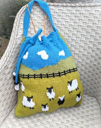An unusual and useful bag featuring sheep in the countryside. This is a very interesting and quick knit in Chunky yarn so it grows very quickly. The front, bottom and back of the bag are knitted in one piece as are the sides and handle of the bag.