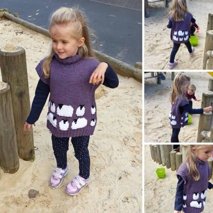 Knitting Pattern for a tunic and hat featuring fluffy sheep. For ages 2 to 10 years.
