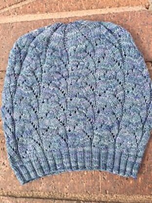 This hat was designed for one of my daughter's college friends. It is a slouchy beanie that will fit an average head. It has a 19.5 inch unstretched circumference and is 10 inches long.