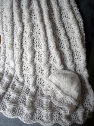 Shells & Scallops measures ca. 70 x 70 cm (27.5 x 27.5 in) and the bonnet comes in two measures, 0-3 months and 3-6 months.
