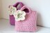 Crocheted out of 2 strands of standard bulky weight yarn in pinks with flower and large shell button embellishment for added appeal.