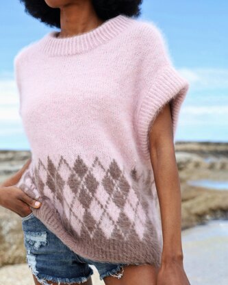 Sherlock Vest is worked in one piece from the top down: first from the neck opening to the armpits flat, then joined to work the rest of the body in the round with an optional decorative colorwork panel and ribbed hem. The upper part is shaped with increases along the faux shoulder seam and the neck opening. In the end, the vest is trimmed with a ribbed neckband – either folded (double) crewneck, or a loose turtleneck, and ribbing along the armholes.