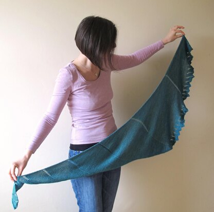 This shawl is worked in from one side to the other, in an increasing spiral lace pattern and finished with spiralling pleats. The effect is like cascading water, or an enormous Conch shell.