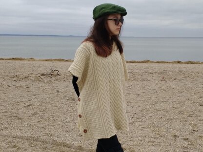 This oversized poncho is a collaborative effort. My eldest daughter drew Celtic knotwork which I translated into the cables in the borders of the poncho. The pattern is rated experienced because of the complexity of some of the cables in the borders. You will need two cable needles to work the most complex cables.