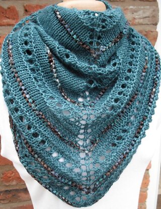 A simple lace pattern shawl, using a contrast yarn to create interest. The colour of the yarns I chose reminded me of shimmering Mediterranean seas – hence the name. The sample is made using Louisa Harding Grace which is a double knit yarn and has 50% silk. A yarn with no silk may not produce the same drape. The colour is dark teal (shade 7). The contrast yarn is Louisa Harding Sari Ribbon which is a bulky ribbon yarn with a lovely metallic sparkle in it. The colour is brown, teal and navy (shade 36). The look of the shawl can be altered easily by choosing a different contrast yarn – for a simple beaded effect try Louisa Harding Grace Hand Beaded. The shawl can be made larger by adding more stocking stitch rows before the main pattern starts. This is a traditional triangular shawl started from the back of the neck and worked downwards. If you are not familiar with this type of construction then you will find plenty of help on youtube.