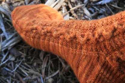 This is a cabled sock pattern with rows of undulating cables representing Shingle Creek, and wide bands of moss stitch, representing the rocky shoreline. This pattern is recommended for knitters who have either had some sock-knitting experience, or some cable pattern experience. However, the pattern is fairly easy to memorize and works up quickly.