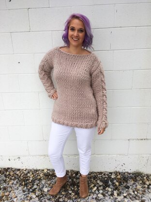 DESCRIPTION: Chunky, oversized, cozy cable knit sweater. This is perfect for anyone who hates pants and wants to live in tights all year round OR just surround themselves in cozy plushy goodness. Pattern includes two sizes.