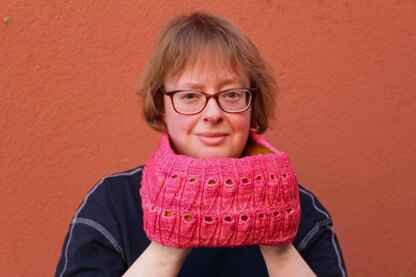 Cendrillon is the French name of Cinderella. In this cowl, her shoes are formed by a multiple yarn over for the opening followed by a series of decreases for the toe-cap. The unique stitch pattern makes a pretty cowl and additional lining makes it extra squishy.