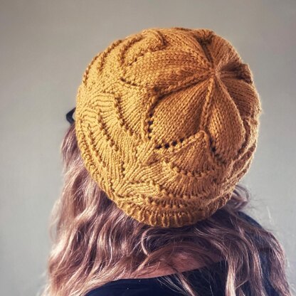 this pretty hat, knitted in Aran weight yarn, is created by increasing over and over and then decreasing all together in one row. The crown is a stunning flower shape, which definitely catches the eye. Links to video instruction for the CDD stitch are included in the pattern.