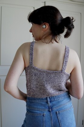 The top is knitted bottom up beginning with the body part knitted in Stockinette Stitch in round. The front part is shaped using German Short Rows method while the back of the design stays open. The main part is finished by knitting an edging in Garter Stitch. Finally, two straps are knitted in Garter Stitch as well and sewed on the back of the top.